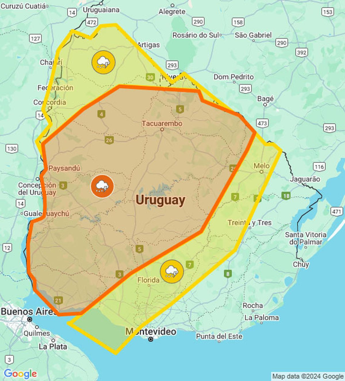 También continúa vigente una alerta amarilla por los mismos fenómenos adversos pero con menor intensidad, en una zona más amplia que va desde Rivera a todo el litoral oeste.