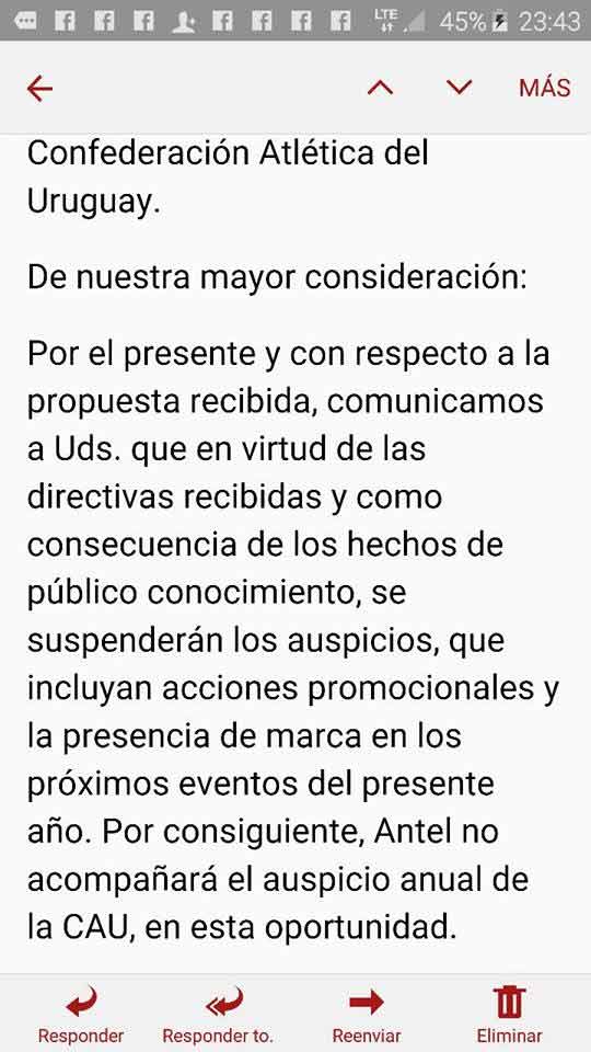 Publicación presidente de CAU al recibir carta con el retiro de apoyo de Antel al atletismo. Muy fuerte e inoportuno. pic.twitter.com/uV99tV5XO6