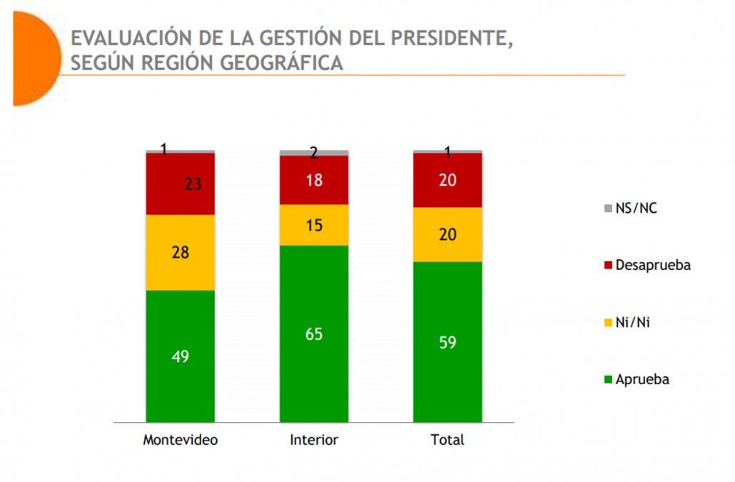 Al analizar las respuestas por zona geográfica se observa que “los juicios positivos sobre el presidente son más intensos en el interior del país (65%) que en Montevideo (49%) pero, incluso en la capital, el balance de aprobación que recibe Lacalle Pou en estos primeros meses de gestión es ampliamente positivo 49% aprobación contra 23% de desaprobación”, señala la consultora.