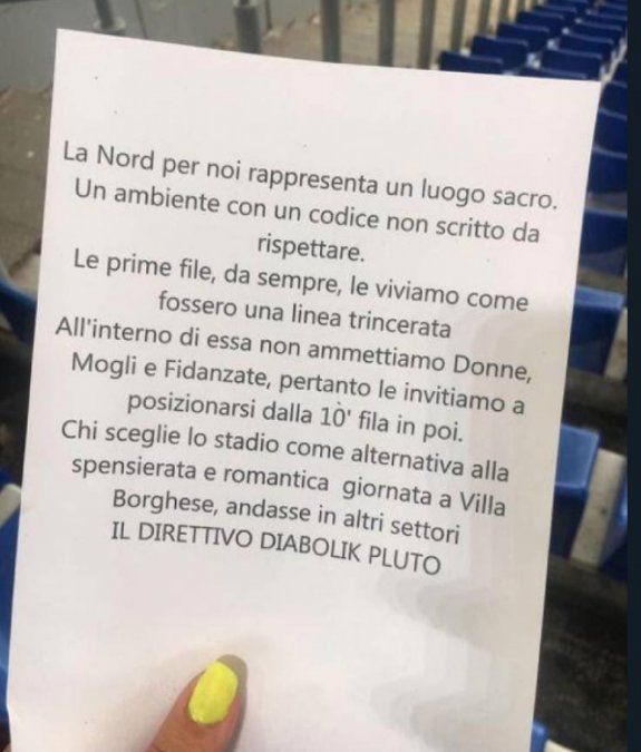 Un texto de origen desconocido en el que se pedía a las mujeres que no ocuparan las diez primeras filas de la tribuna Norte del estadio Olímpico de Roma, la de los Ultras del Lazio, fue distribuida el sábado durante el encuentro perdido por ese equipo ante el Nápoles, publicaron varios medios italianos.
