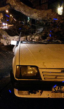 Arboles caídos y un auto destrozado por el fuerte temporal en Montevideo