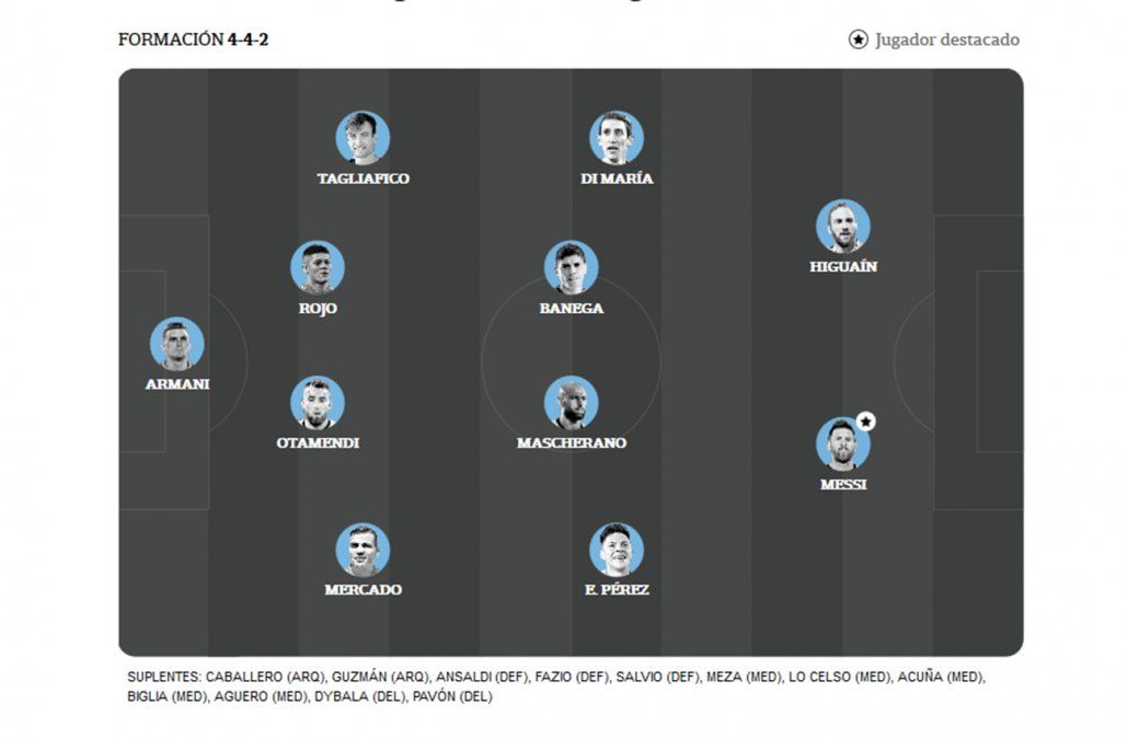 Franco Armani , Gabriel Mercado , Nicolás Otamendi , Marcos Rojo , Nicolás Tagliafico , Enzo Pérez , Javier Mascherano , Ever Banega , Ángel Di María , Lionel Messi y Gonzalo Higuaín .