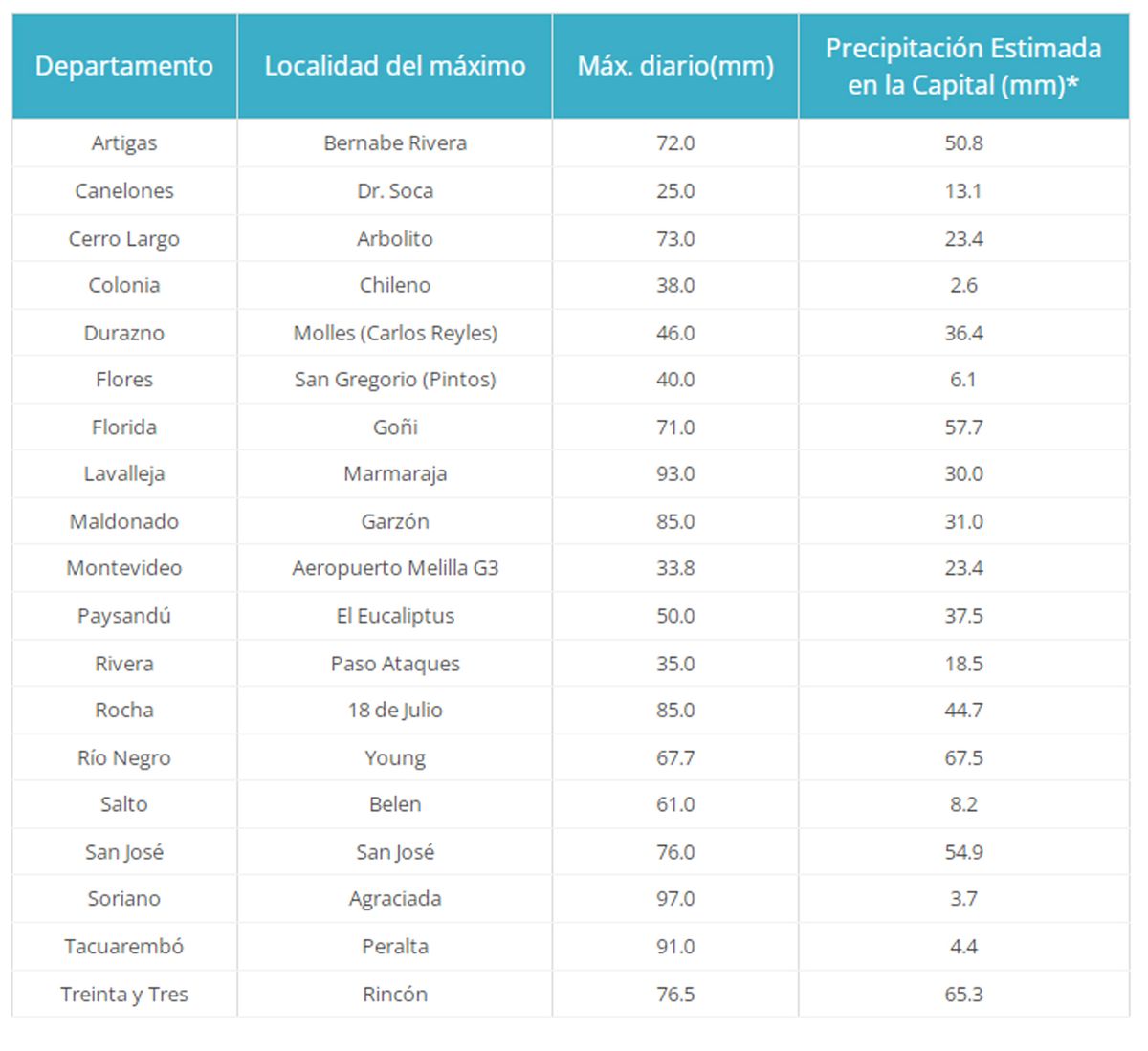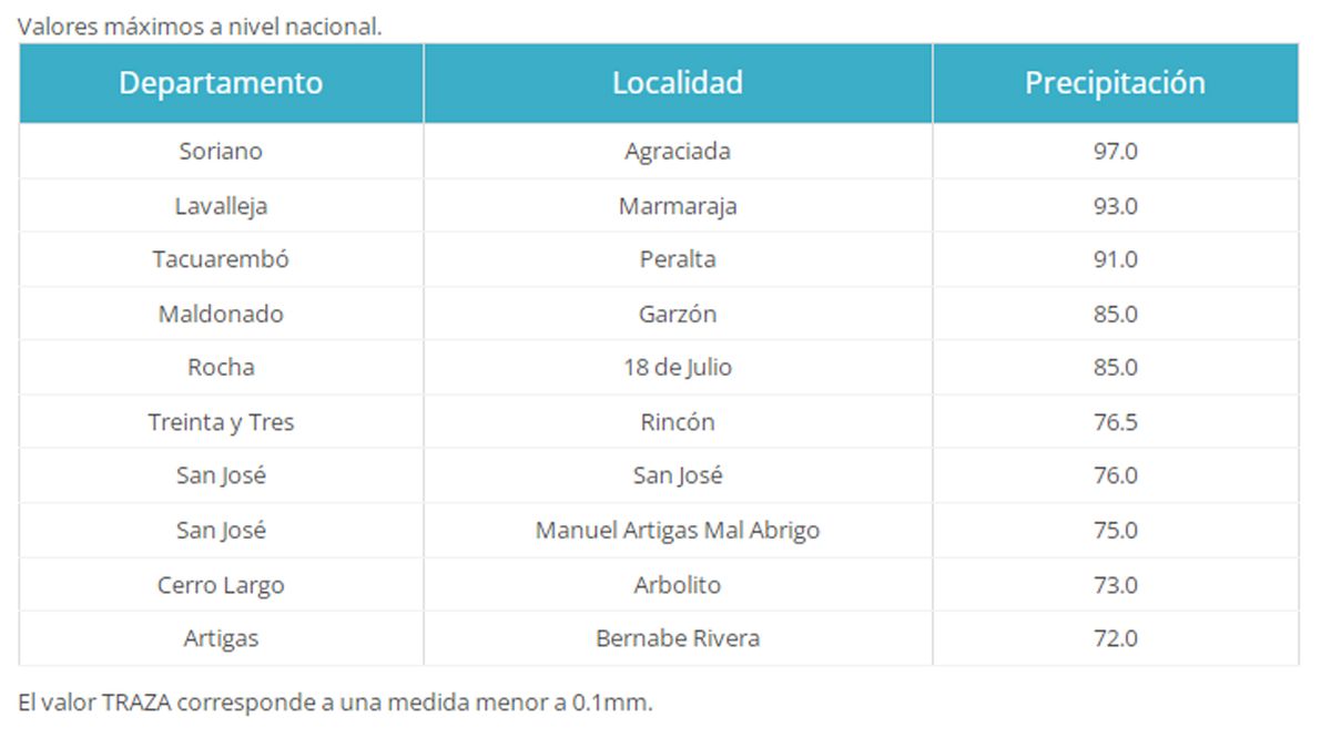 En cuanto a los máximos y mínimos registrados, Meteorología da cuenta de que en Agraciada, Soriano, cayeron 97 mm. En Marmaraja, Lavalleja, 93 mm. En Peralta, Tacuarembó, 91 mm.