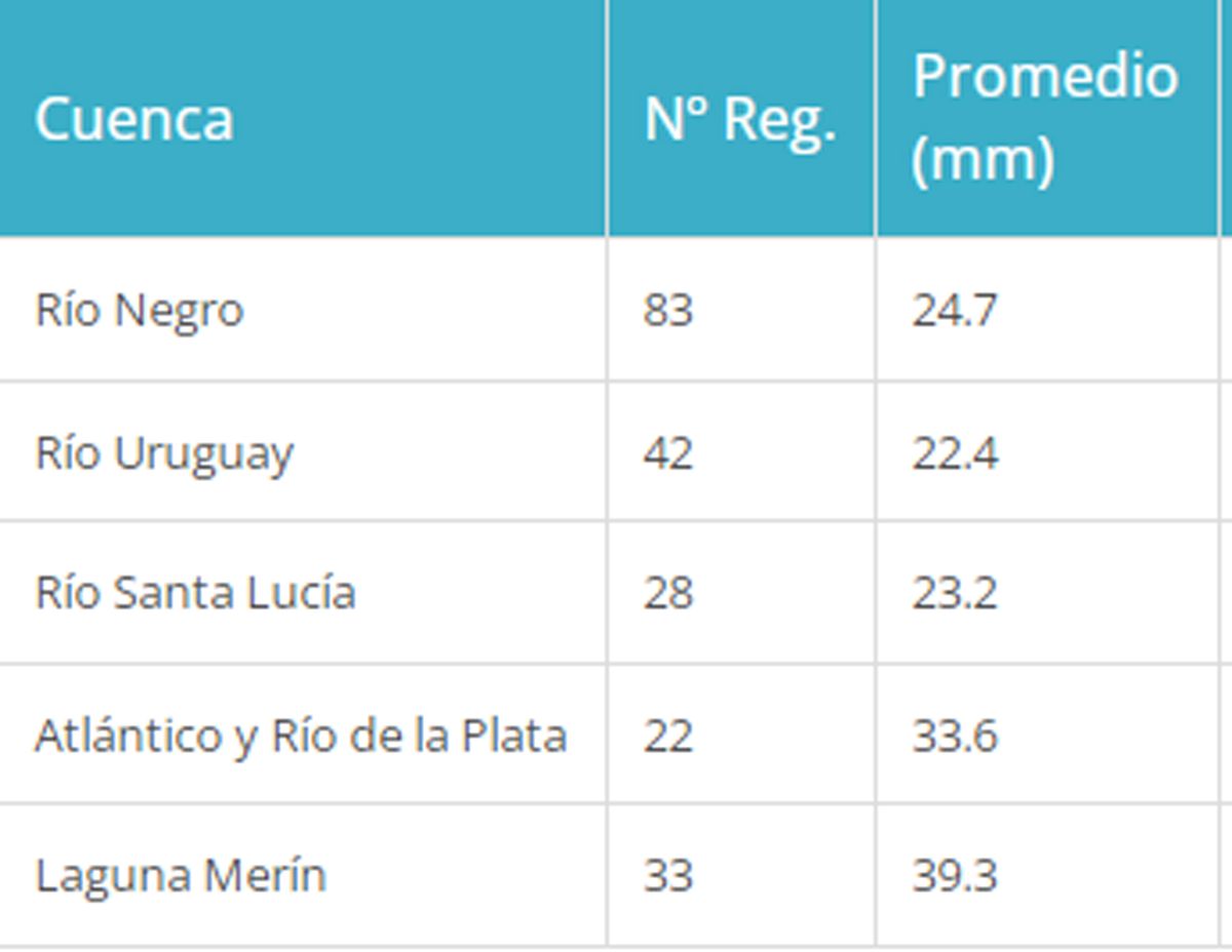 Le sigue la cuenca del Río Negro con 24.7 mm de promedio, la del Santa Lucía con 23.2 mm, y por último la cuenca del Río Uruguay con 22.4 mm.
