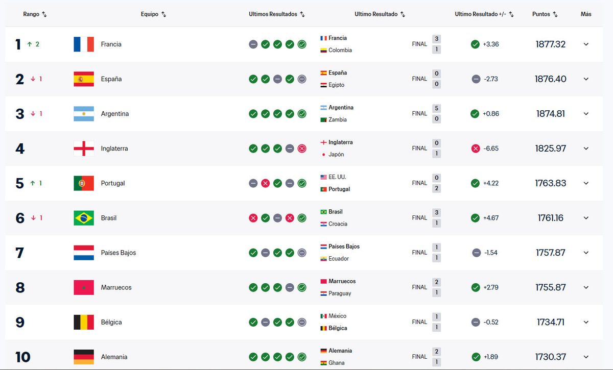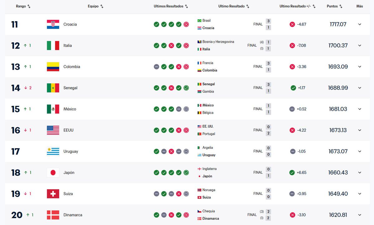 En tanto Uruguay se mantiene entre los primeros 20, en una lista que llega al puesto 211. La Celeste está 200 puntos abajo de los líderes, en el puesto 17. Perdió poco más de un punto tras los empates ante Inglaterra (1-1) y Argelia (0-0).
