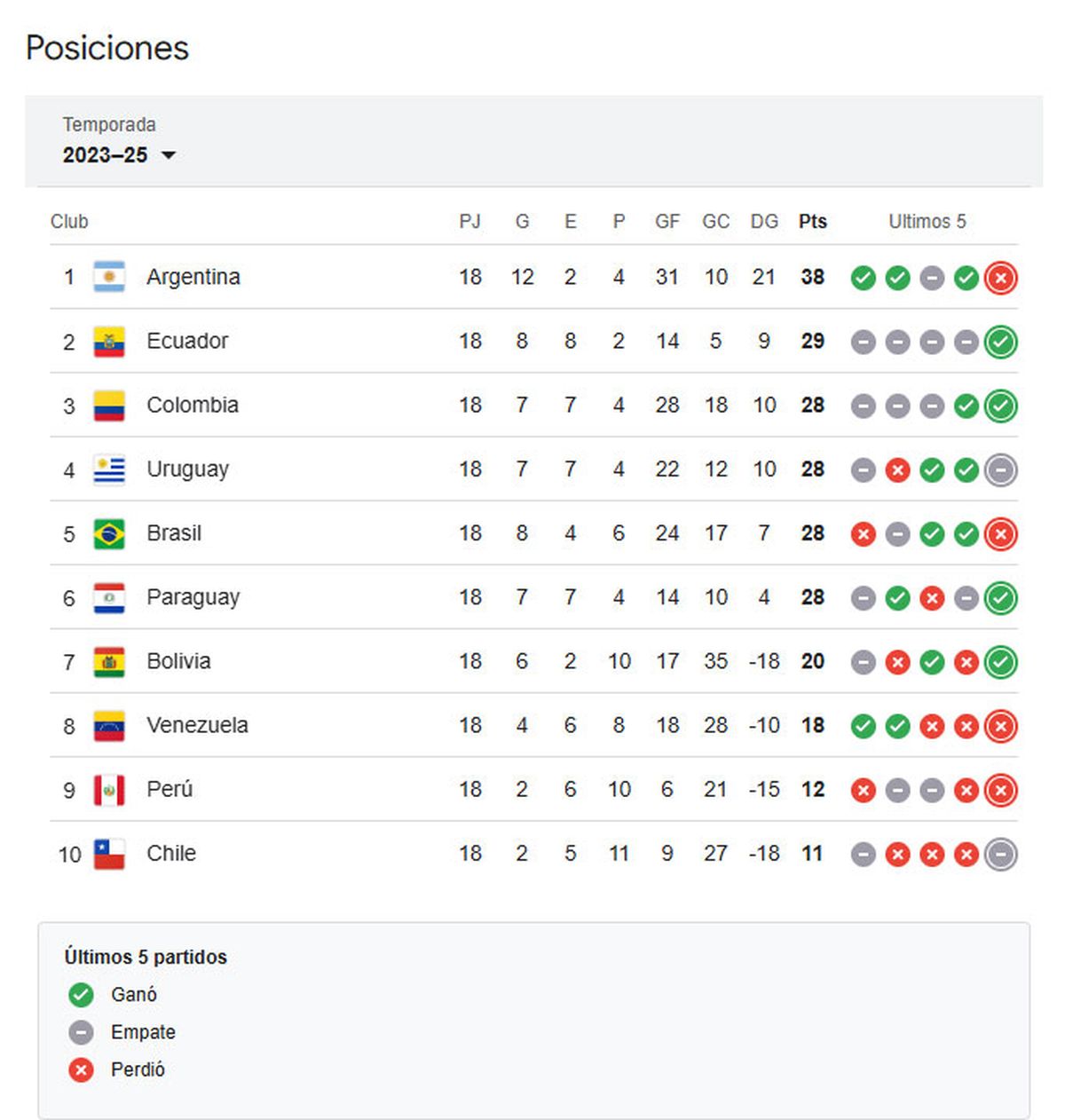 Con la misma cantidad de puntos (28) quedaron Uruguay (cuarto), Brasil (quinto) y Paraguay (sexto).