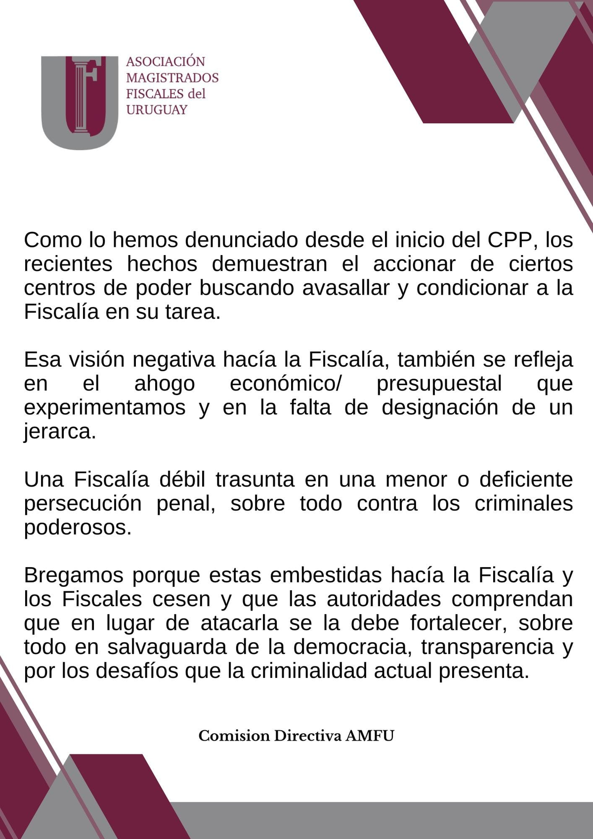 "Como lo hemos denunciado desde el inicio del Código de Proceso Penal (2017), los recientes hechos demuestran el accionar de ciertos centros de poder buscando avasallar y condicionar a la Fiscalía en su tarea. Esa visión negativa hacía la Fiscalía, también se refleja en el ahogo económico/presupuestal que experimentamos y en la falta de designación de un jerarca", señaló.