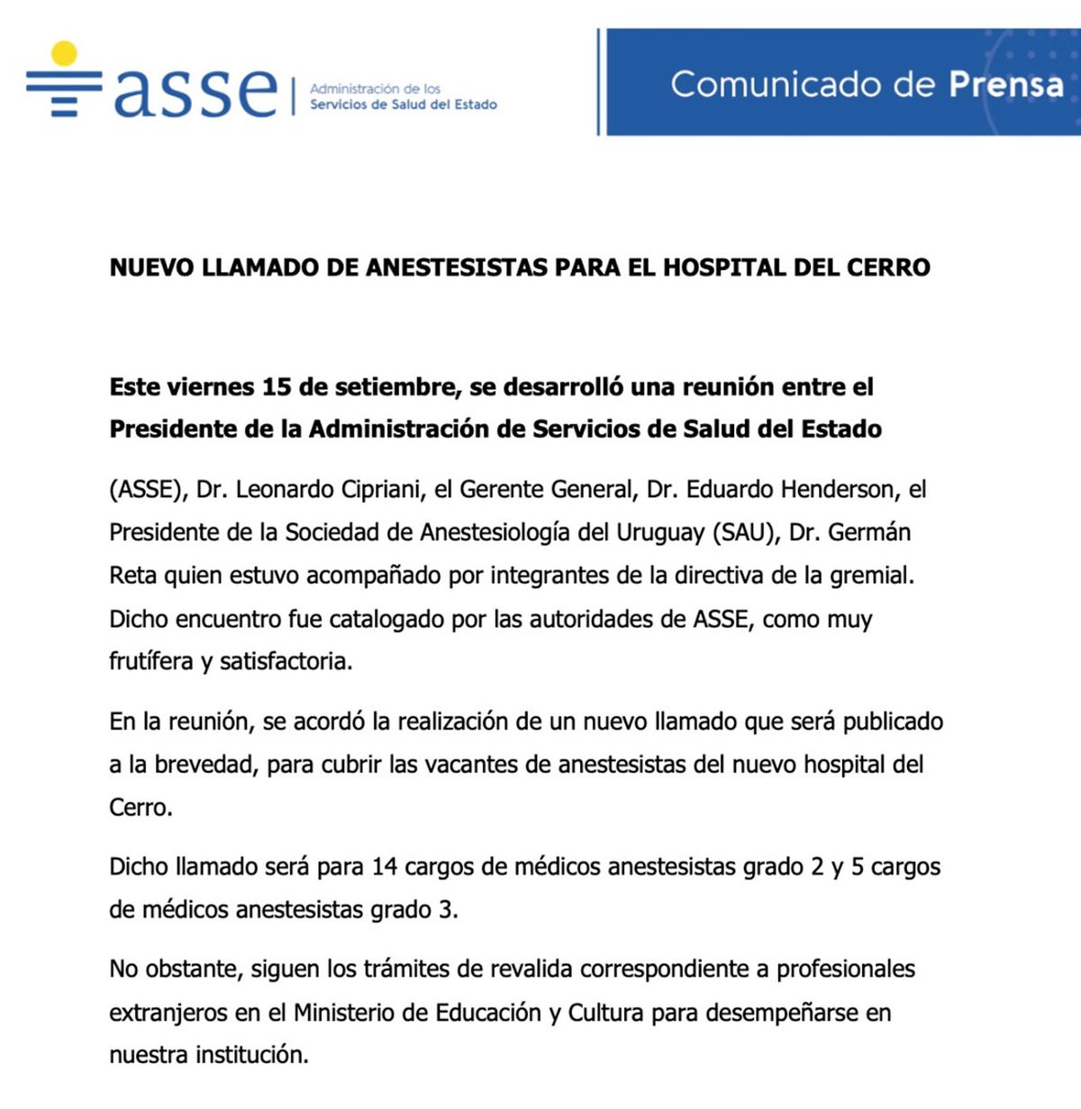 Luego de ese encuentro, ASSE publicó el comunicado en el que anuncia un nuevo llamado para 19 cargos de anestesistas a trabajar en el nuevo hospital del Cerro.