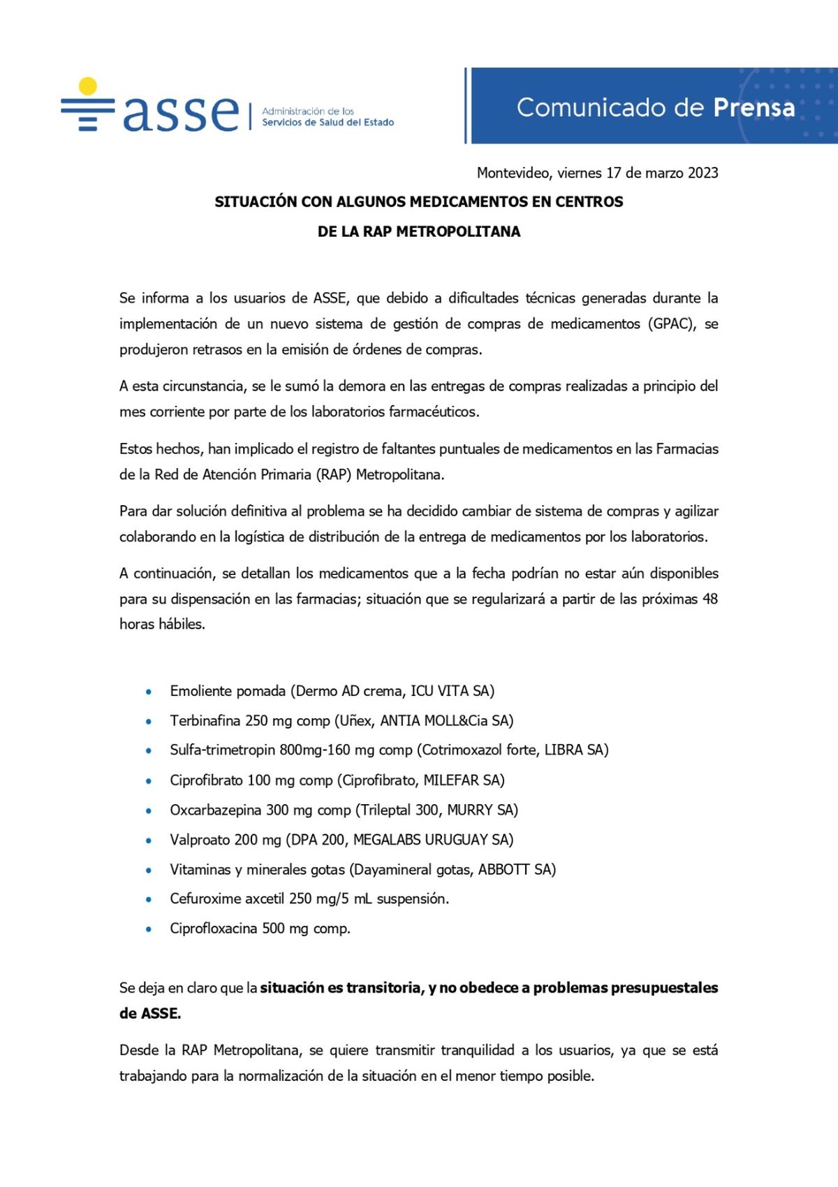 La Administración de los Servicios de Salud del Estado (ASSE) informó este viernes sobre “faltantes puntuales” de nueve medicamentos en las farmacias de la Red de Atención Primaria (RAP) Metropolitana.