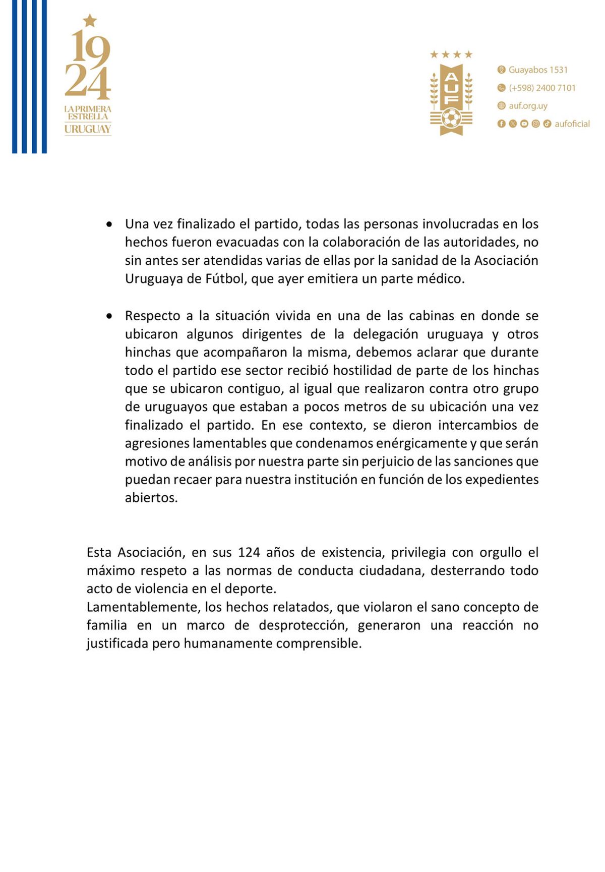 La Asociación Uruguaya de Fútbol (AUF) emitió un comunicado en el que denuncia que durante el partido de Uruguay-Colombia "no había mecanismos de seguridad suficientes" en la tribuna, donde se generaron los disturbios.