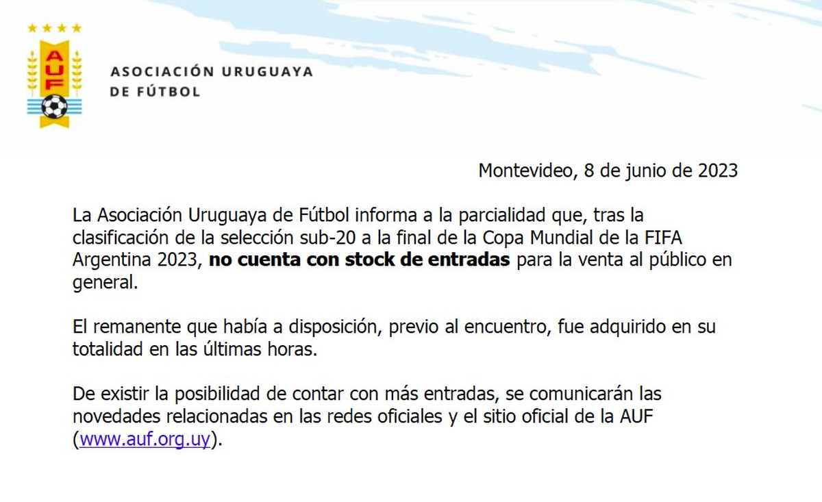 La Asociación Uruguaya de Fútbol (AUF) dijo que no tiene stock de entradas para ver a Uruguay en la final del Mundial Sub-20.