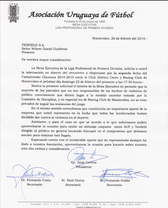 En una carta enviada este miércoles, la Mesa Ejecutiva de la Liga Profesional de Primera División solicitó a la empresa Tenfield televise en directo el partido que Cerro y Racing jugarán el próximo domingo en el estadio Luis Tróccoli a las 17.30 horas. El partido dispuesto para ser televisado era Atenas-Danubio.