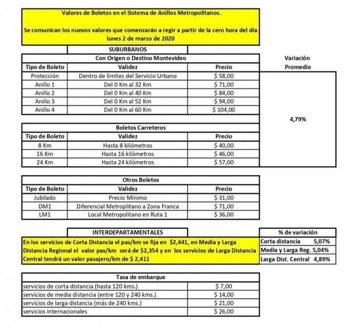 En el caso del boleto suburbano, que tiene como origen o destino Montevideo o el llamado boleto carretero, el aumento será de 4.79%. Mientras que el precio del boleto interdepartamental variará según las diferentes modalidades.