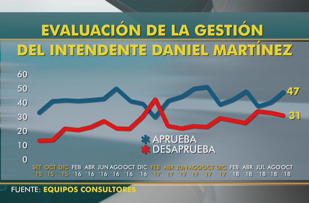 La encuesta de Equipos Consultores realizada en octubre, muestra un nuevo incremento en la aprobación de la gestión del intendente Daniel Martínez, y una caída en la desaprobación.