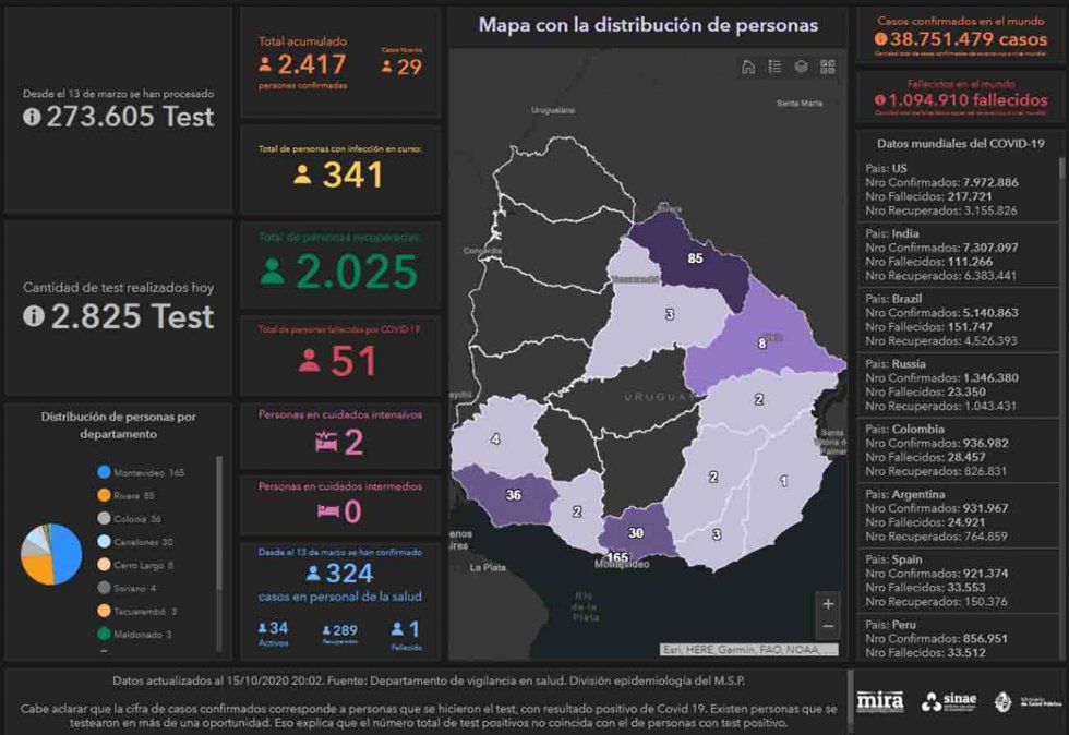 Este jueves se registraron 29 casos nuevos de Coronavirus Covid-19, en una base de 2.825 análisis procesados, lo que da una cifra total de 2.417 casos positivos acumulados desde que comenzó la emergencia sanitaria en marzo. De estos casos, 12 son de Montevideo, seis de Rivera, cinco de Canelones, cuatro de Colonia, uno de Cerro Largo y uno de Tacuarembó.