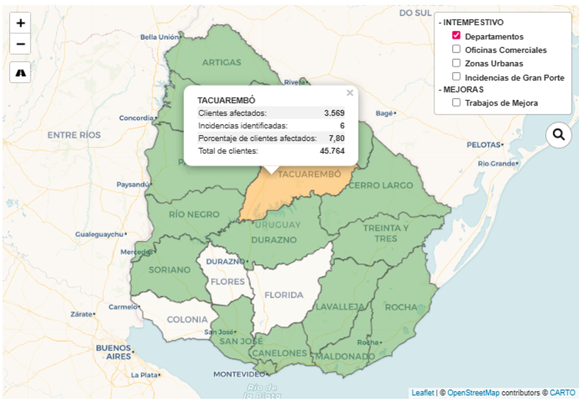 Este miércoles, la zona más afectada por el corte de luz era al sur del río Negro. Este jueves sobre las 17:00 horas, el mapa interactivo de UTE mostraba a Tacuarembó como el departamento con más cortes y los servicios casi totalmente reestablecidos en el resto del país.