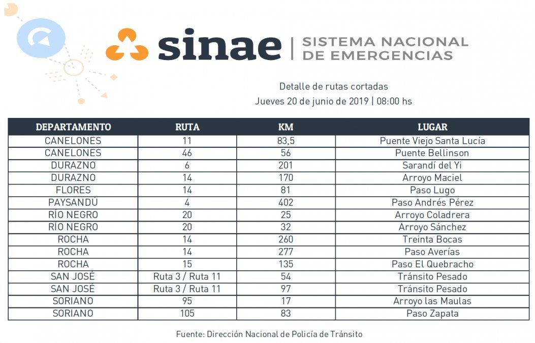 En Canelones, hay 162 evacuados y 1.332 autoevacuados, que totalizan 1.494 desplazados. En Soriano, debieron abandonar sus viviendas 334 personas; en San José 257; en Florida 237; en Treinta y Tres 205; en Flores 17 y en Río Negro 1.