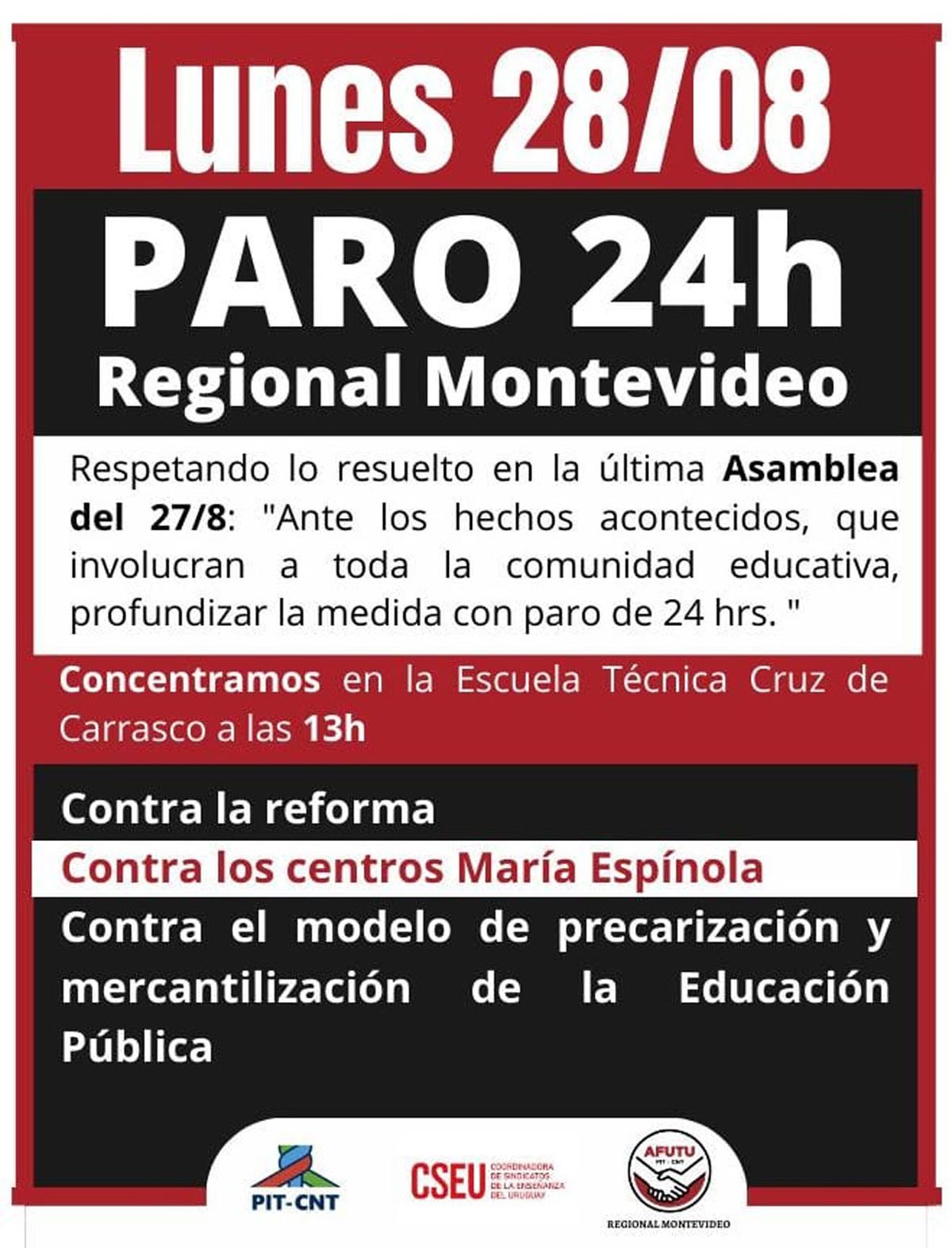 Además, el paro es “contra la reforma” educativa que lleva adelante el gobierno desde la Administración Nacional de Educación Pública (Anep), “contra los Centros María Espínola”, y contra lo que denominan “el modelo de precarización y mercantilización de la Educación Pública”.
