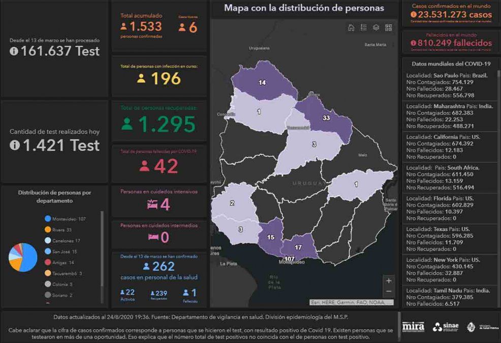 Este lunes se sumaron seis casos nuevos de coronavirus Covid-19, lo que da una cifra total de 1.533 casos positivos acumulados desde que comenzó la emergencia sanitaria en marzo. De estos seis, cuatro corresponden al departamento de Montevideo y dos a Canelones.