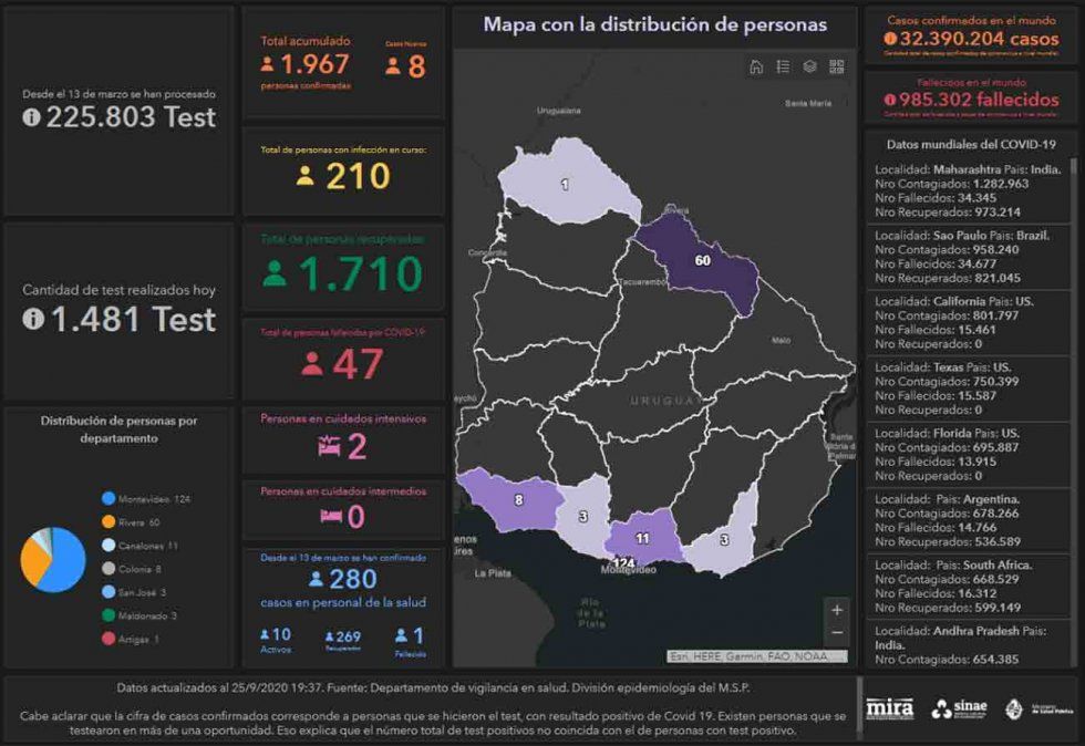 Según el último informe epidemiológico del Sistema Nacional de Emergencias (SINAE) actualmente hay 210 personas que están cursando la enfermedad, de las cuales 2 de ellas se encuentra en cuidados intensivos. Los departamentos con casos activos al día de hoy son 7: Artigas, Canelones, Colonia, Maldonado, Montevideo, Rivera y San José.
