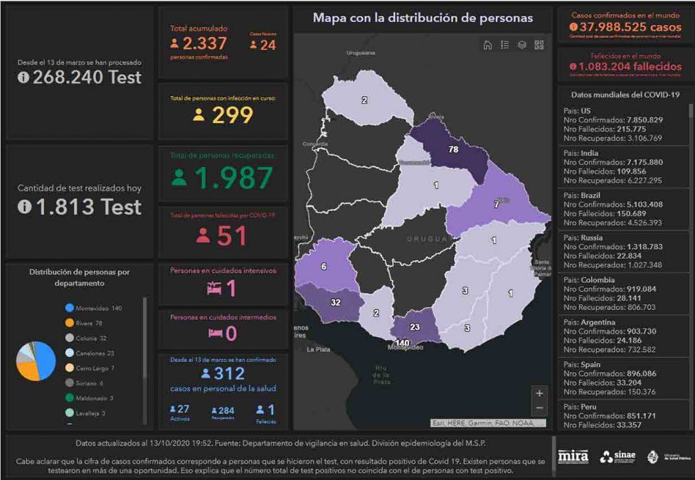 Este martes se registraron 24 casos nuevos de coronavirus Covid-19, en una base de 1.813 análisis procesados, lo que da una cifra total de 2.337 positivos acumulados desde que comenzó la emergencia sanitaria en marzo. De los casos nuevos, nueve son de Rivera, seis de Montevideo, tres de Canelones, tres de Colonia; en tanto, en Lavalleja, Tacuarembó y Treinta y Tres se registraron un caso nuevo en cada departamento.