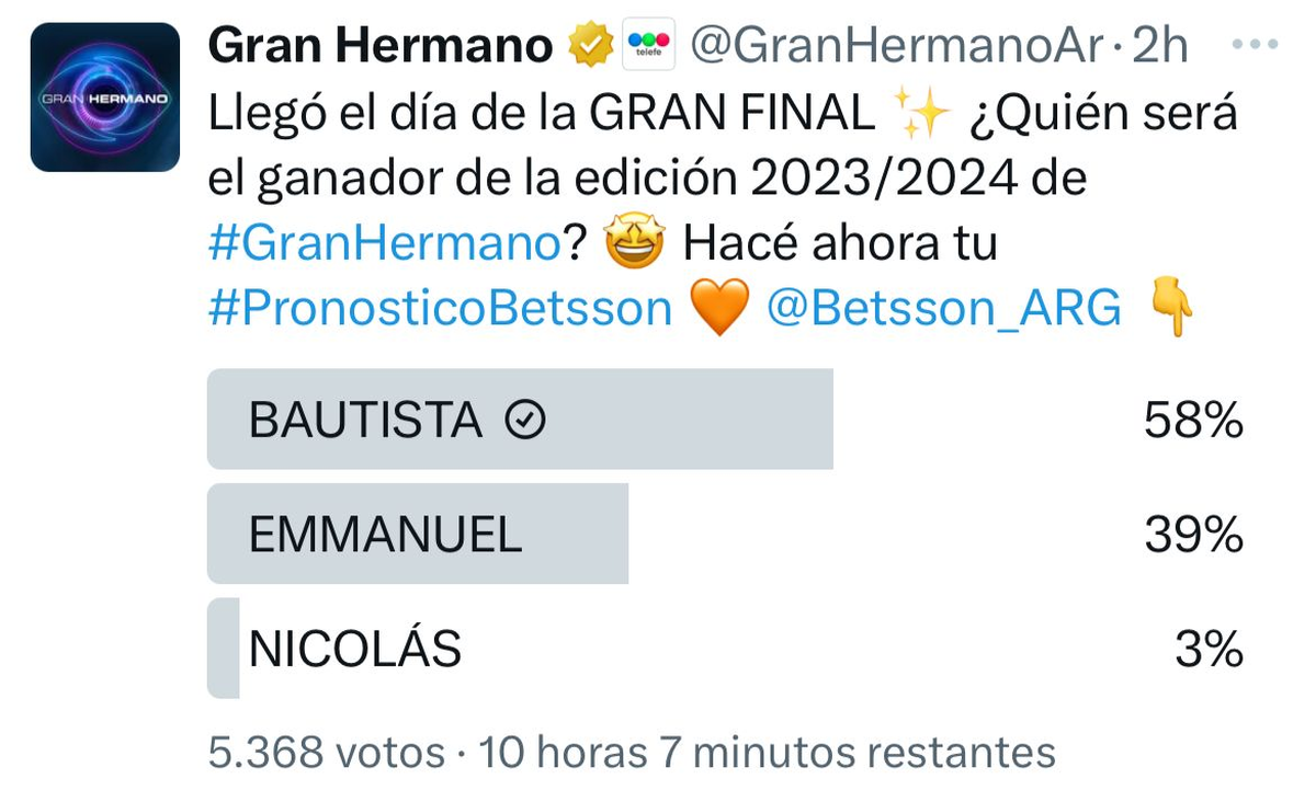 Una encuesta realizada en la cuenta de X de Gran Hermano, sobre las 14:00 horas de este domingo, daba como ganador al uruguayo, le sigue el peluquero cordobés y luego está Nicolás, con el 58%, 39% y 3% de los votos respectivamente.