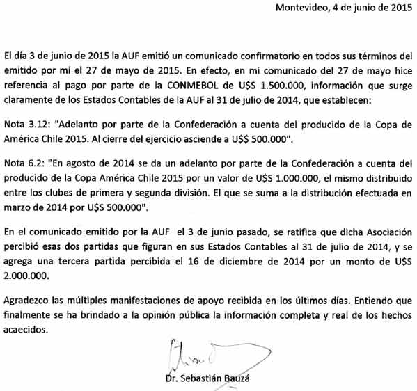Bauzá había dicho que recibió de la Conmebol un pago por 1,5 millones de dólares como adelanto de la participación de Uruguay en la Copa América de Chile 2015, que comienza la semana próxima.