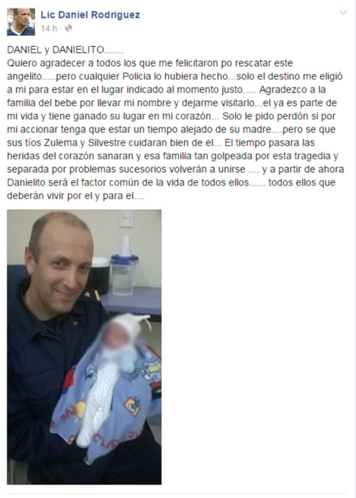 “Quiero agradecer a todos los que me felicitaron por rescatar este angelito.....pero cualquier Policía lo hubiera hecho...solo el destino me eligió a mi para estar en el lugar indicado al momento justo”, escribió este martes el policía Daniel Rodríguez en su cuenta de Facebook.