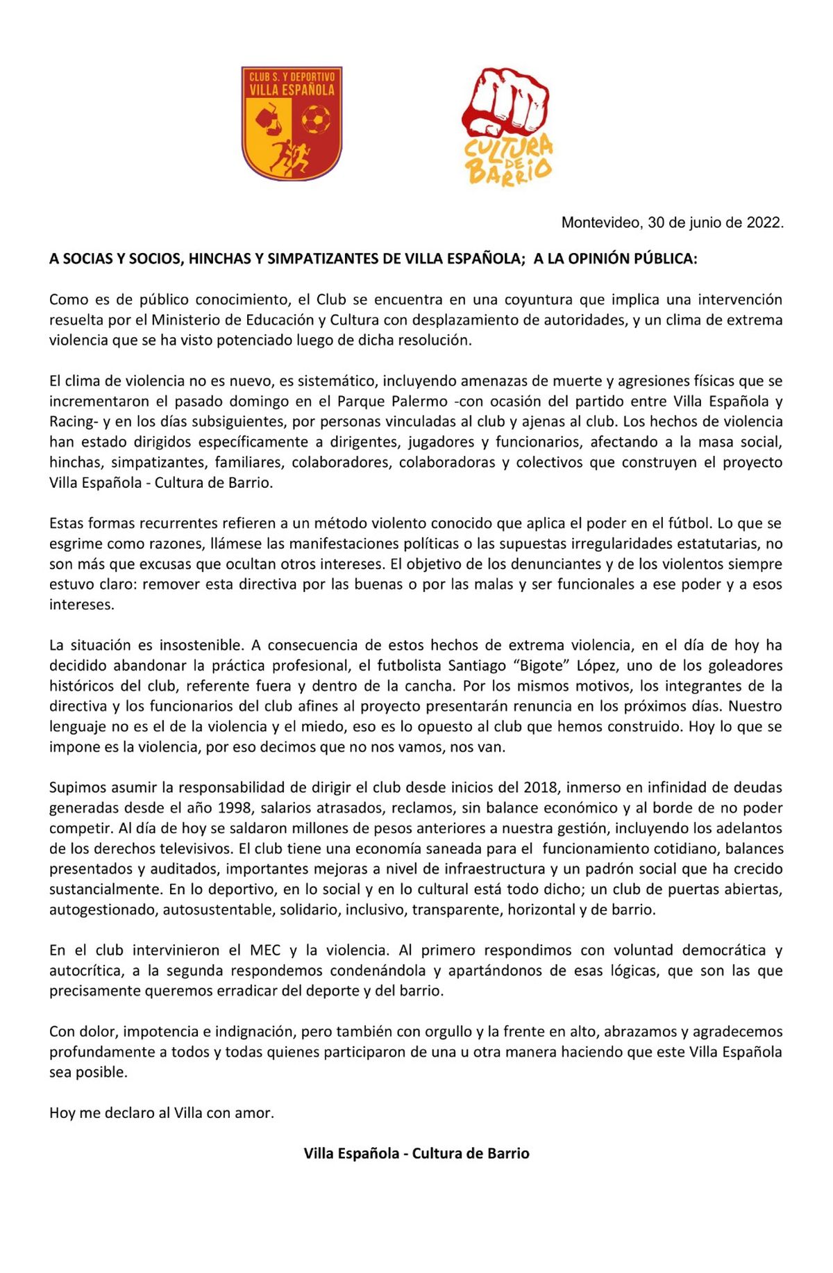 Villa Española anunció este jueves en un comunicado dirigido a la opinión pública que el jugador Santiago “Bigote” López, goleador y referente del club, decidió abandonar la práctica profesional, y que la directiva actual renunciará en los próximos días.
