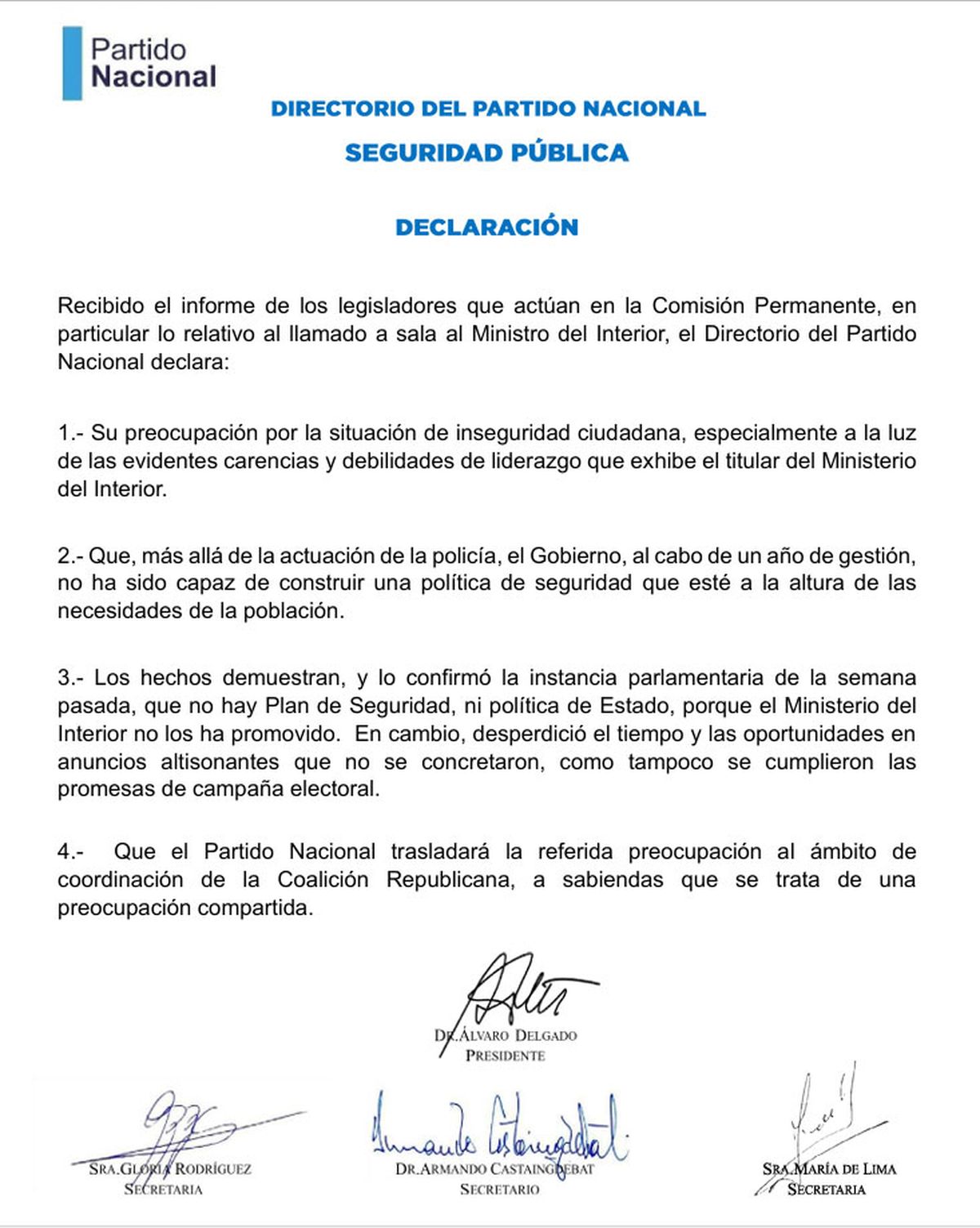 El Partido Nacional expresó “preocupación por la situación de inseguridad ciudadana, especialmente a la luz de las evidentes carencias y debilidades de liderazgo que exhibe el titular del Ministerio del Interior”, dice la declaración publicada este lunes pasado el mediodía.