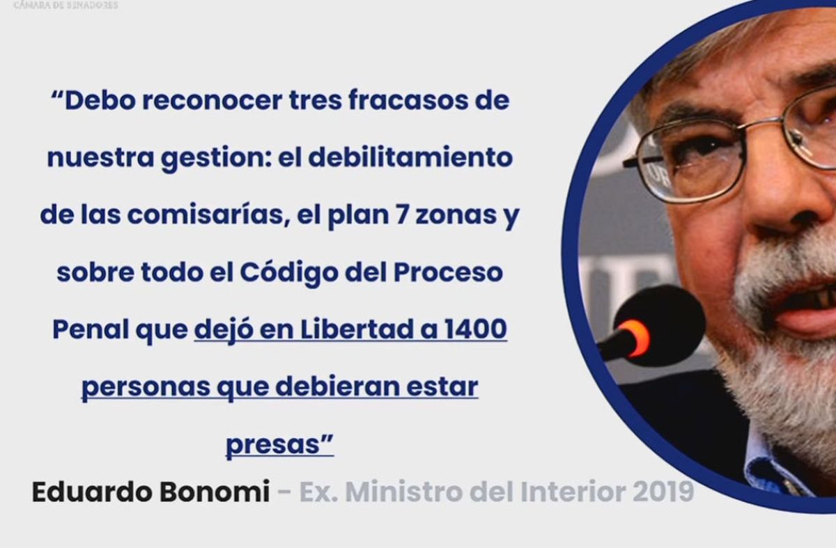 Luego, el senador colorado enumeró lo que a su entender fueron errores conceptuales de la izquierda en políticas de seguridad, y recordó la liberación de presos en el primer gobierno (2005-2010), la idea de que el delito tenia "una causa social vinculada a la pobreza", y "aquello de la sensación térmica, de que Uruguay estaba bien en seguridad pero la percepción era otra".