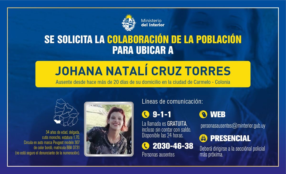 El Ministerio del Interior solicita la colaboración de la población para ubicar a una mujer de 34 años que está ausente de su domicilio en la ciudad de Carmelo, en Colonia, desde hace más de 20 días.