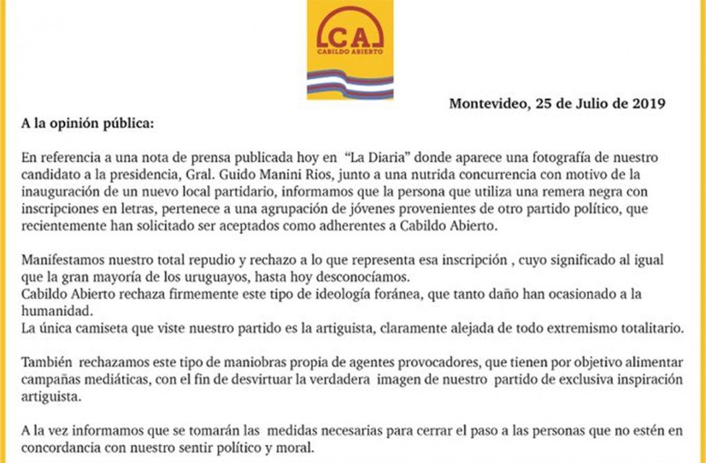 Horas más tarde, Cabildo Abierto emitió un comunicado donde informa que la persona que luche esa remera pertenece a una agrupación de jóvenes proveniente de otro partido político que hace poco solicitaron ser aceptados como adherentes.