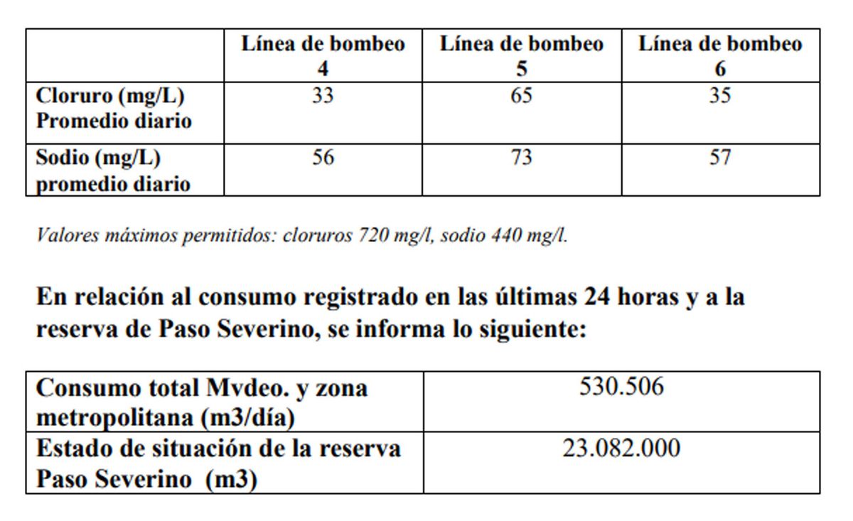 Los datos de este sábado, publicados por Presidencia, indican que el promedio diario de sodio en las tres líneas de bombeo que llegan a la capital y la zona metropolitana fueron de 56, 73 y 57 miligramos por litro. El viernes estos valores estaban en 152, 160 y 156.