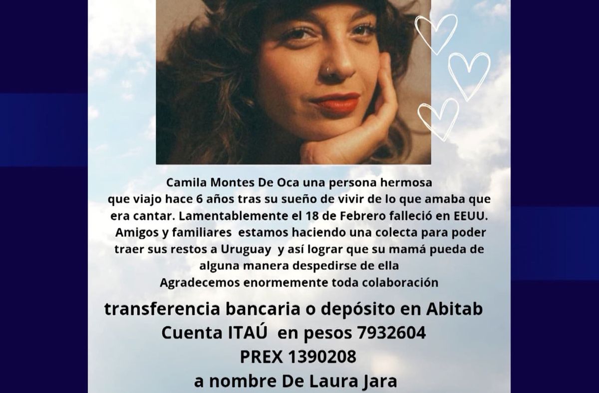 La familia de Camila Montes de Oca, una joven uruguaya fallecida en Estados Unidos el pasado 18 de febrero, pide colaboración económica para poder repatriar su cuerpo, para hacerlo necesitan más de 10 mil dólares.