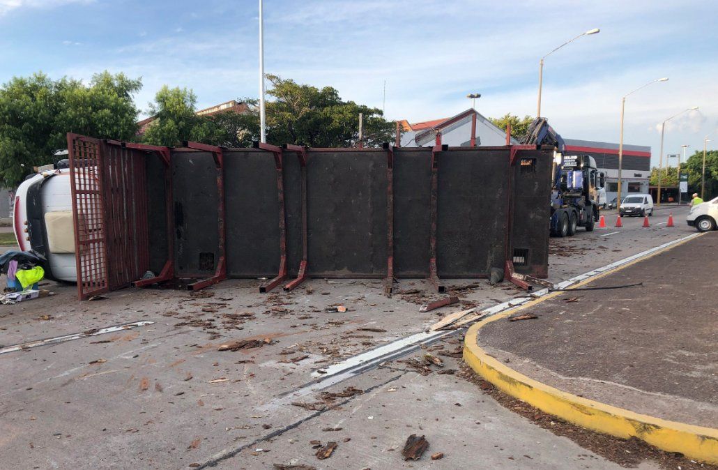 Camión cargado de madera volcó en la rambla portuaria; los dos ocupantes ilesos