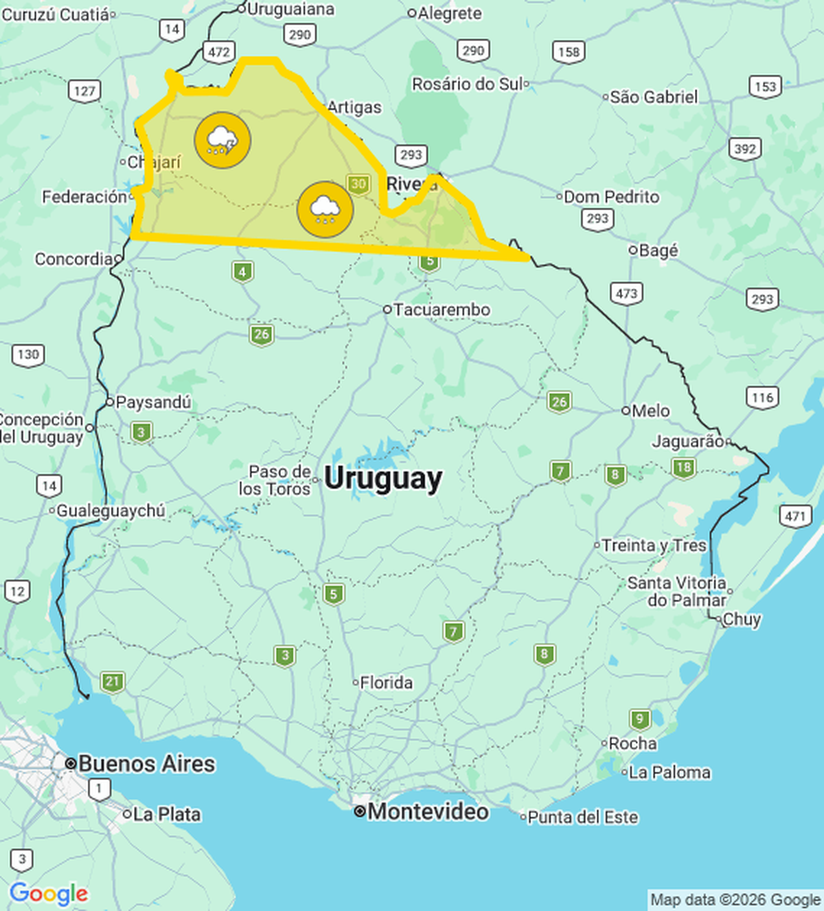 Los departamentos de Artigas, Rivera y Salto tienen varias localidades bajo advertencia. Allí puede registrarse actividad eléctrica, caída de granizo, lluvias abundantes.