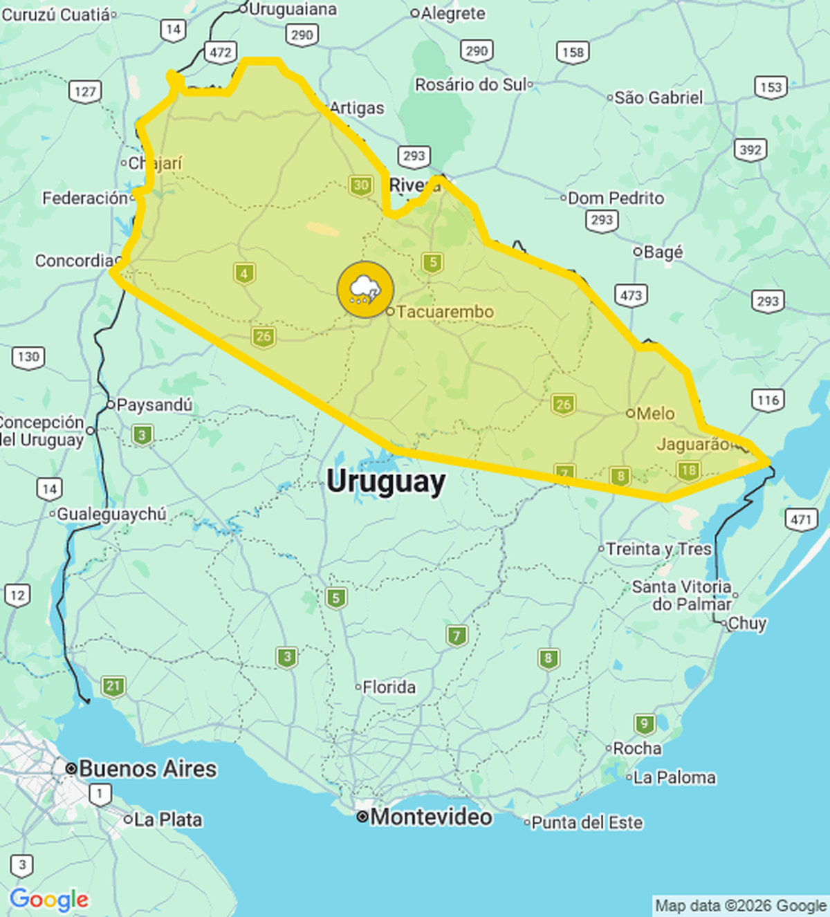 "Depresión atmosférica comienza a afectar el país, generando tormentas algunas puntualmente fuertes. Cabe destacar que en zonas de tormentas se podrán registrar lluvias abundantes en cortos períodos, ocasional caída de granizo, intensa actividad eléctrica y rachas de vientos fuertes", informó el Instituto Uruguayo de Meteorología en un comunicado.