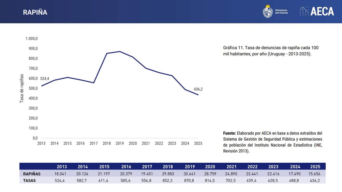 En términos de tasa, en 2019 se registraban 852,3 rapiñas cada 100 mil habitantes, mientras que en 2025 esa cifra descendió a 436,2.