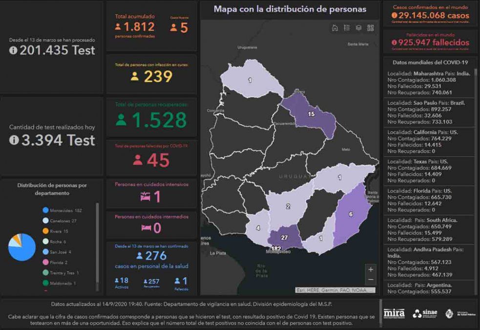 Según el último informe del Sistema Nacional de Emergencias (SINAE) actualmente hay 239 personas cursando la enfermedad y una de ellas se encuentra internada en cuidados intensivos. Además, los departamentos con casos activos al día de hoy son 9: Artigas, Canelones, Florida, Maldonado, Montevideo, Rivera, Rocha, San José y Treinta y Tres.