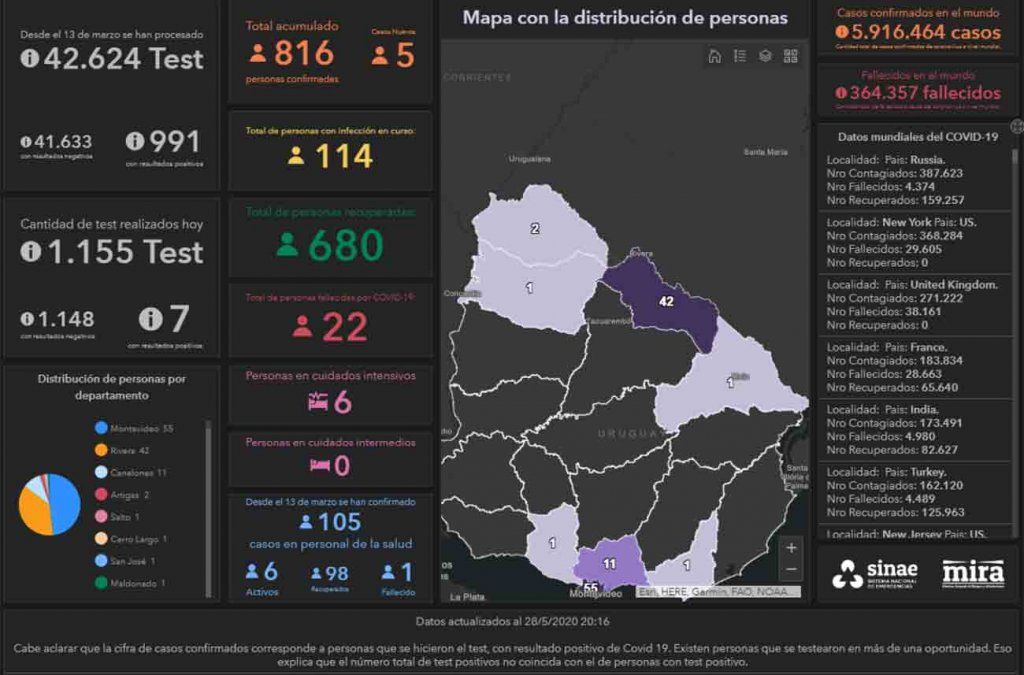 Uruguay sumó este viernes cinco nuevos casos de coronavirus COVID-19, dos de ellos en el departamento de Rivera. Según el último informe del Sistema Nacional de Emergencias (SINAE) hasta el momento se hicieron 156 test de trazo epidemiológico, con 143 resultados negativos y 13 positivos, en dicho departamento. Asimismo, se procesaron 838 test aleatorios los cuales dieron todos negativos.