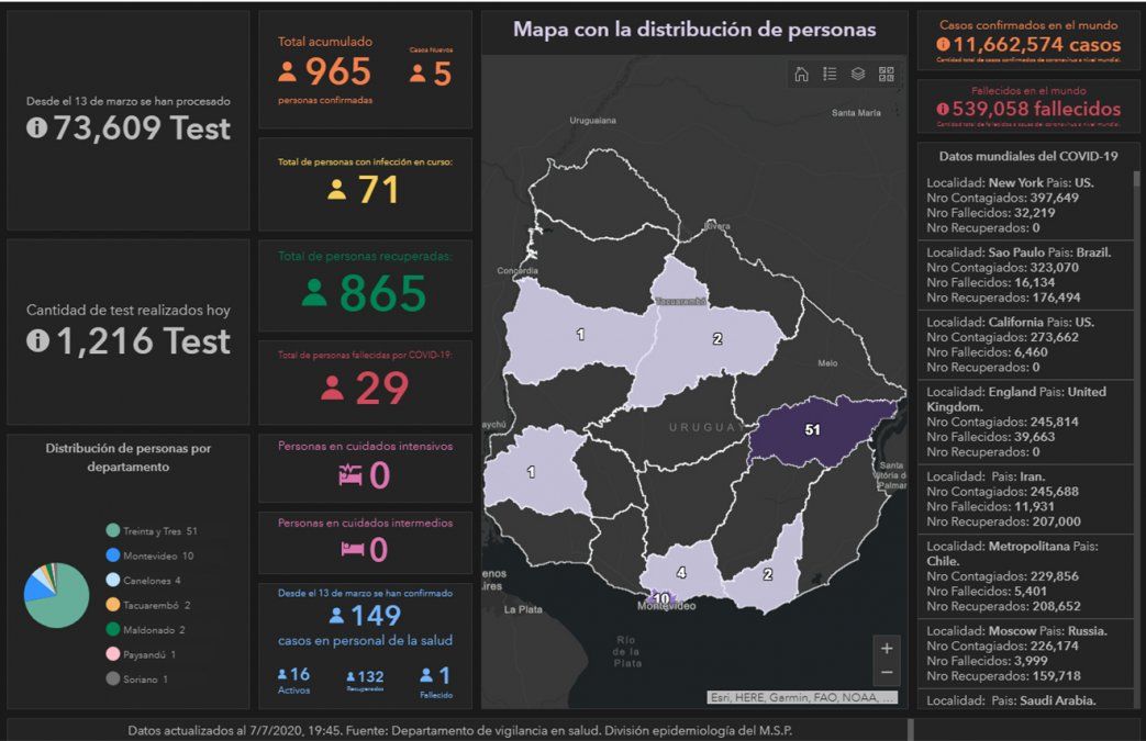Los departamentos con casos activos ahora son: Canelones, Maldonado, Montevideo, Paysandú, Soriano, Tacuarembó y Treinta y Tres.