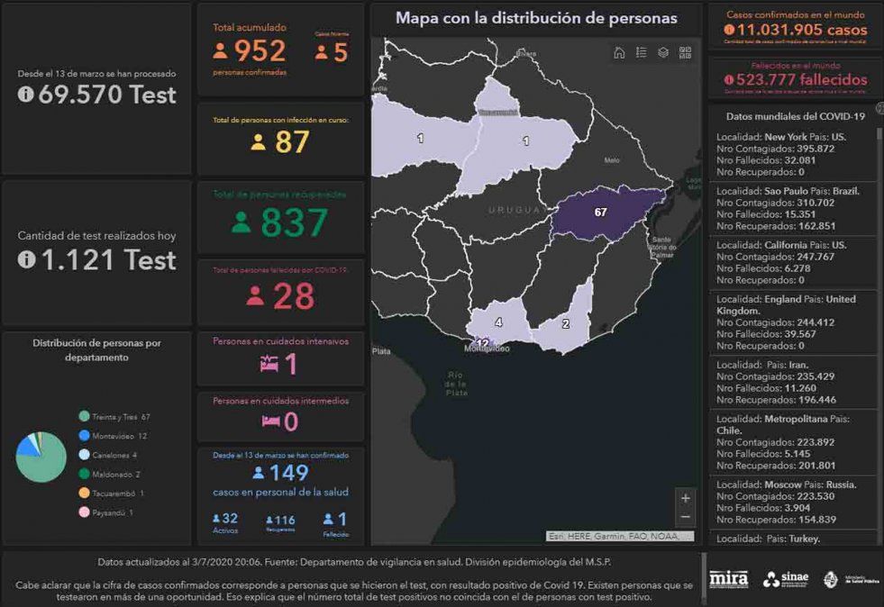 Según los últimos datos del informe epidemiológico del Sistema Nacional de Emergencias (SINAE), del total de casos acumulados 837 ya se recuperaron, 28 personas fallecieron; además hay 149 que corresponden al personal de la salud. De este último total, 116 ya se recuperaron, 32 cursan la enfermedad y un profesional de la salud falleció en abril.