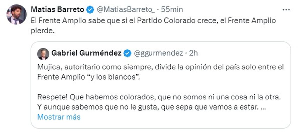El expresidente de Antel y precandidato colorado, Gabriel Gurméndez, se expresó en las redes sociales. "Mujica, autoritario como siempre, divide la opinión del país solo entre el Frente Amplio 'y los blancos'", comenzó su reflexión en X. Y reclamó: "Respete! Que habemos colorados, que no somos ni una cosa ni la otra. Y aunque sabemos que no le gusta, que sepa que vamos a estar. Y con fuerza. Se va a enterar", concluyó.