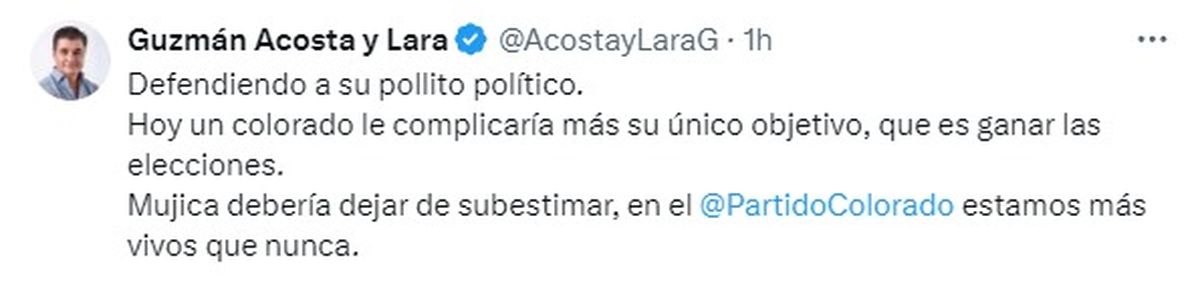 En tanto, el también precandidato colorado, el exdirector nacional de Telecomunicaciones, Guzmán Acosta y Lara, respondió a los dichos del expresidente. "Defendiendo a su pollito político. Hoy un colorado le complicaría más su único objetivo, que es ganar las elecciones. Mujica debería dejar de subestimar, en el Partido Colorado estamos más vivos que nunca", indicó.