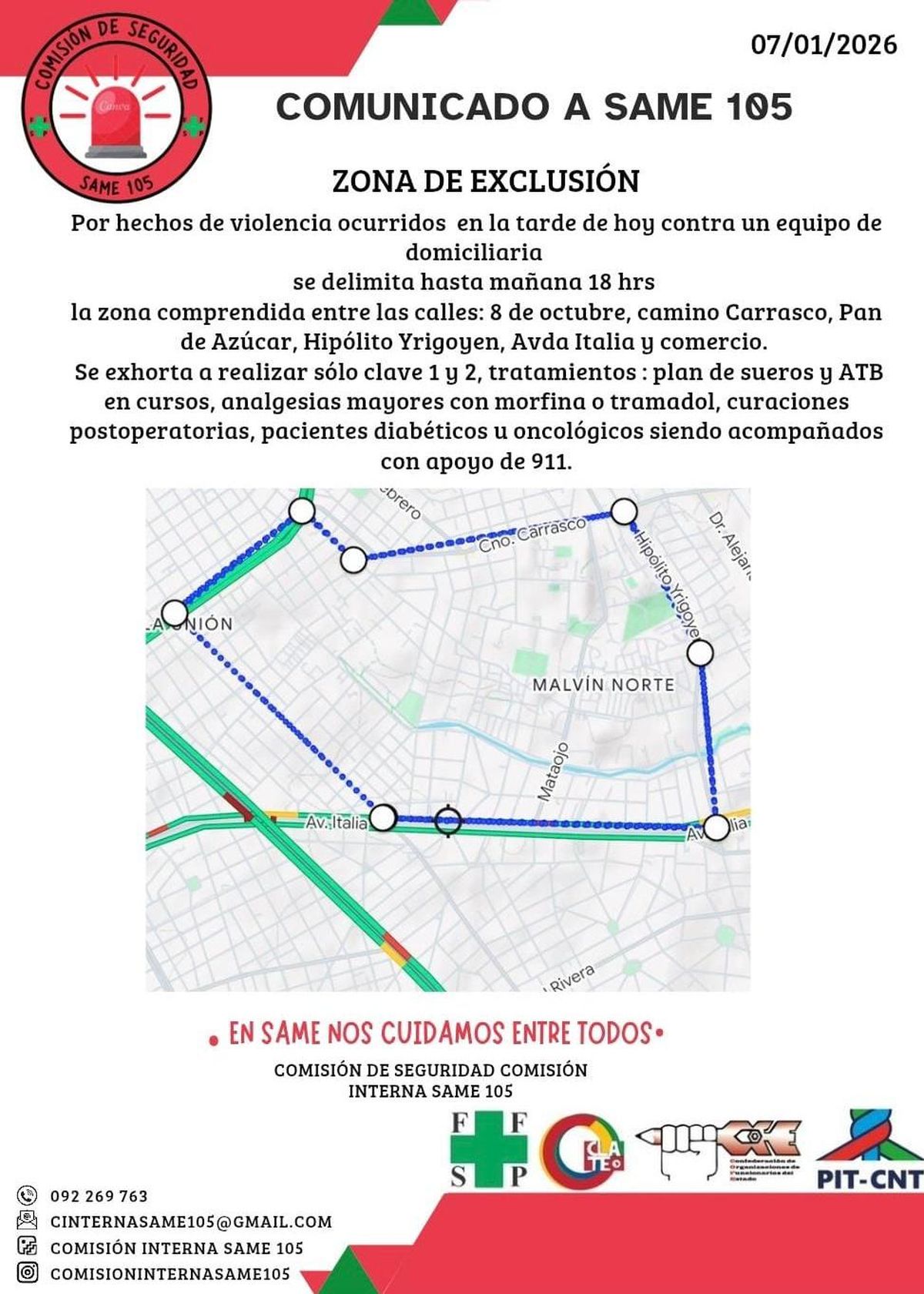 La Comisión de Seguridad de SAME 105 emitió un comunicado a raíz del intento de rapiña a un equipo de la salud de ASSE en Malvín Norte en el que detalla la zona de exclusión que comienza a regir en la tarde de este miércoles.
