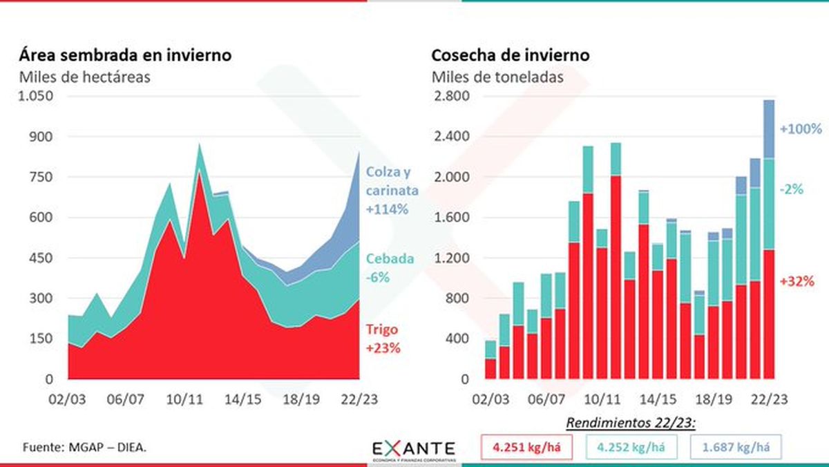 En el invierno 2022 el área sembrada tuvo un extraordinario incremento y los rendimientos se mantuvieron en niveles muy altos, dejando elevados volúmenes de producción; en particular, sobresalió el crecimiento de la colza/carinata, cuya cosecha se duplicó.