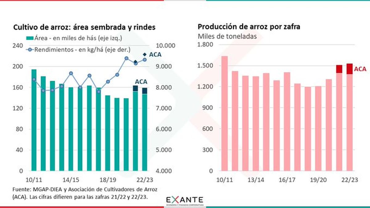 El arroz, en cambio, tuvo una muy buena zafra, con rendimientos nuevamente muy elevados (superiores a 9.500 kg/hectárea según la Asociación de Cultivadores de Arroz).