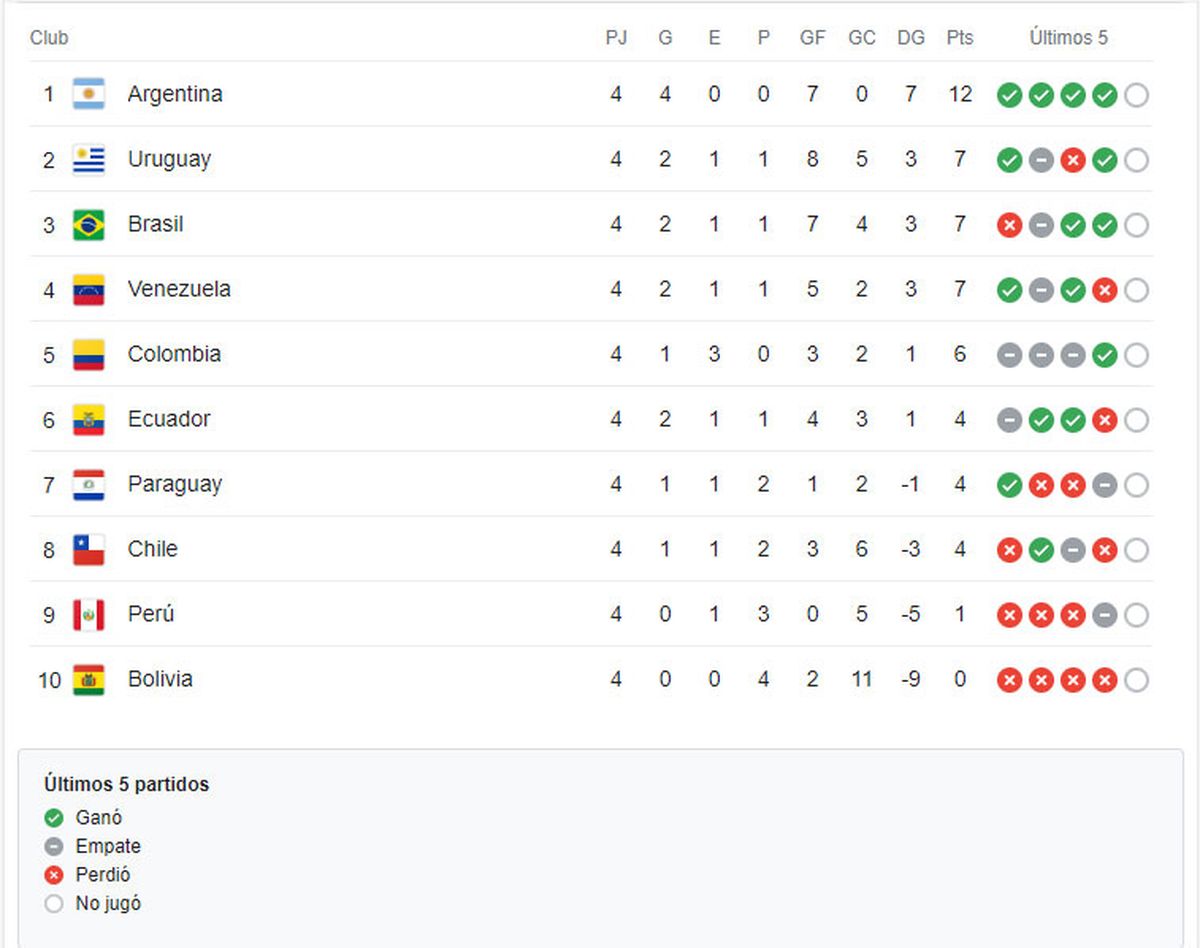 Argentina lidera con puntaje perfecto: cuatro victorias en cuatro partidos que suman 12 puntos y pone a la alibiceleste en camino expreso a la próxima Copa del Mundo que se jugará en México, Estados Unidos y Canadá.