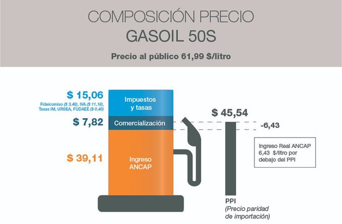 De ese total, 15,06 pesos corresponden a impuestos (IVA), tasas (de la IMM) y los fideicomisos del gasoil y el de eficiencia energética. Además, 7,82 pesos responden al costo de comercialización y 39,11 a los ingresos netos de ANCAP.